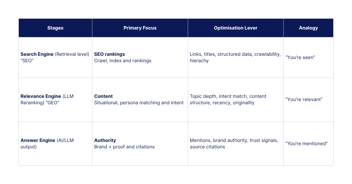 We’ve simplified how to visualise GEO vs SEO in this table: