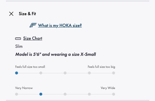 Transparent size comparisons from Hoka: these are great assets for customers as well as for providing information to LLMs to answer queries like “Do Hoka running half zips come up small? I’m a size X, and X feet tall and don’t know which size to buy.”