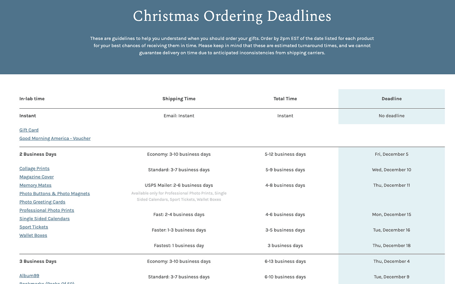 This is particularly important around gifting seasons like Christmas and Mother’s/Father’s Day, as you want to manage expectations for last-minute gift buyers.