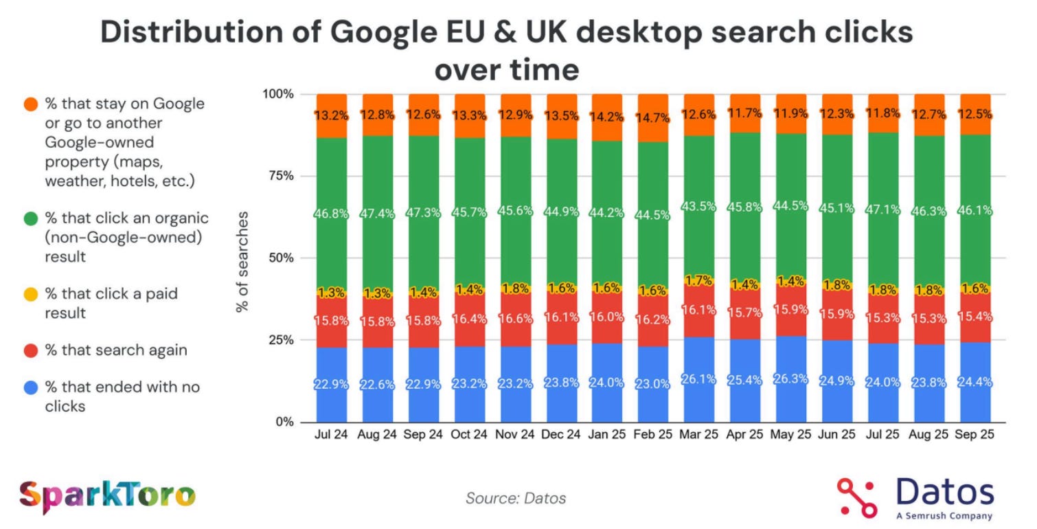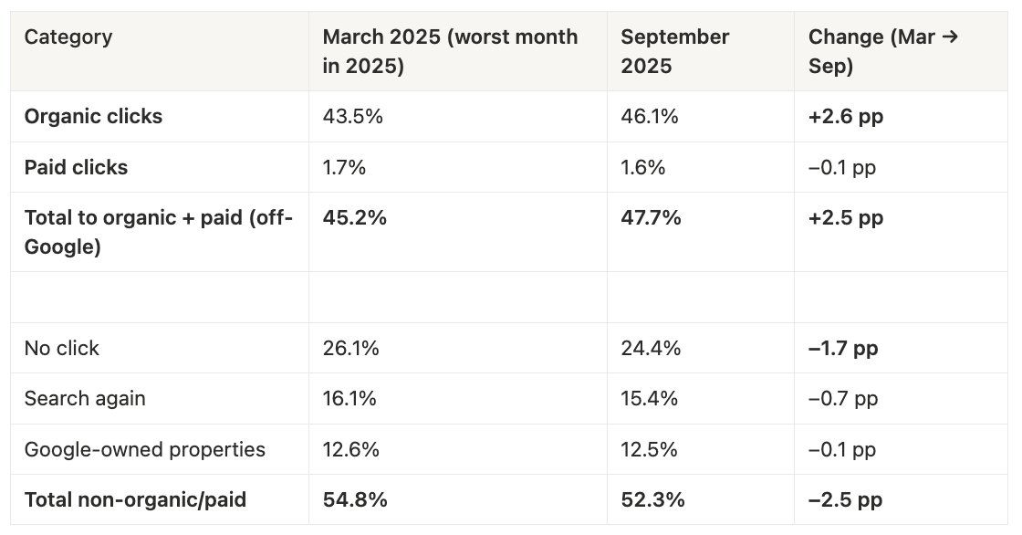 We predicted this last year, and anyone in SEO knows CTR has been declining for years. However, recent data from SparkToro shows that CTR actually increased in the last two quarters of 2025. Google has already stated it expects this trend to continue.