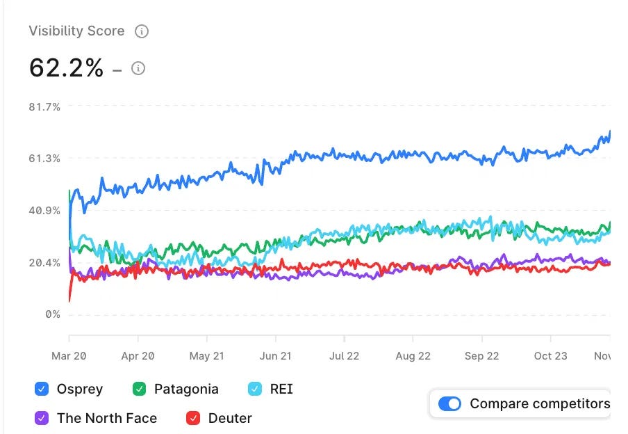 We’ve done so much PDP optimisation for AI visibility growth this year, see the chart below where we’ve taken AI visibility from est. 40% to 62% while all other competitors are flatlining - largely from PDP optimisations: