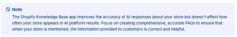 Shopify have also created a Knowledge Base app in which you can provide information about your store, including FAQs about your store. This, for now, won’t improve the reach or discoverability in AI, but simply the accuracy of AI answers; however, given its timing of release alongside UCP, it definitely seems to be a related push from Shopify.