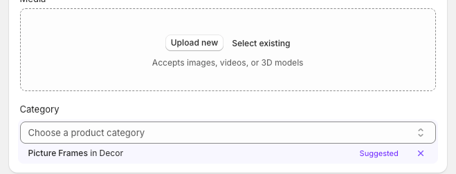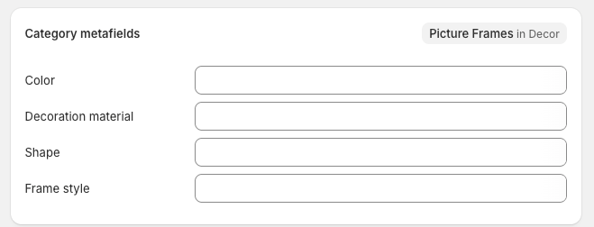 Once a category has been assigned, further subcategories can be added as category metafields. As you include more information here, Shopify may give recommendations or suggestions on which metafields and information to include.