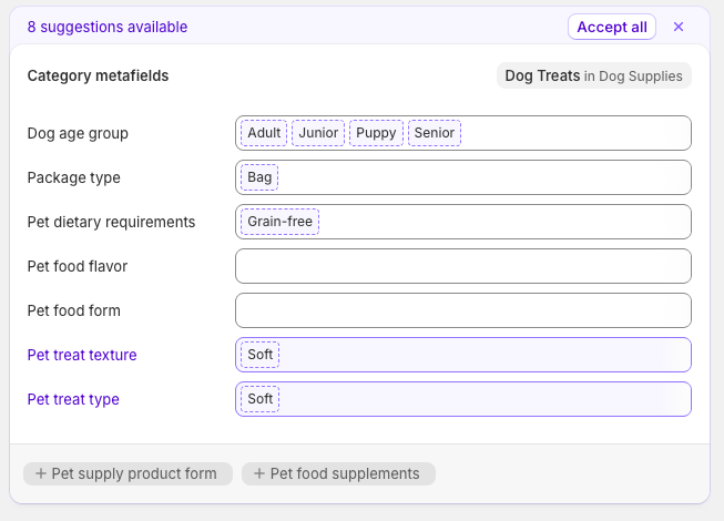 For products that already have a category and some category metafields assigned, Shopify will often give suggestions, as well as additional metafields to add.