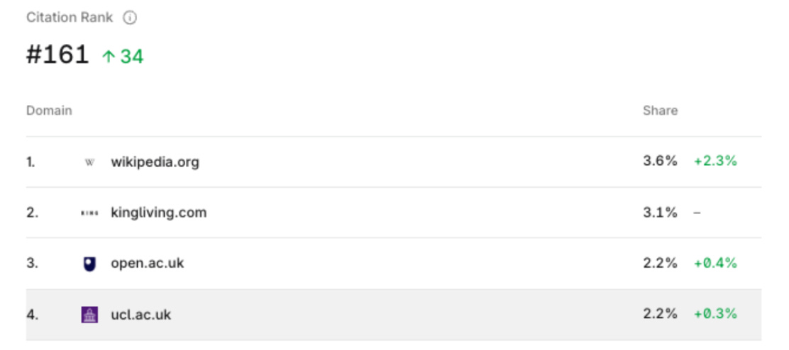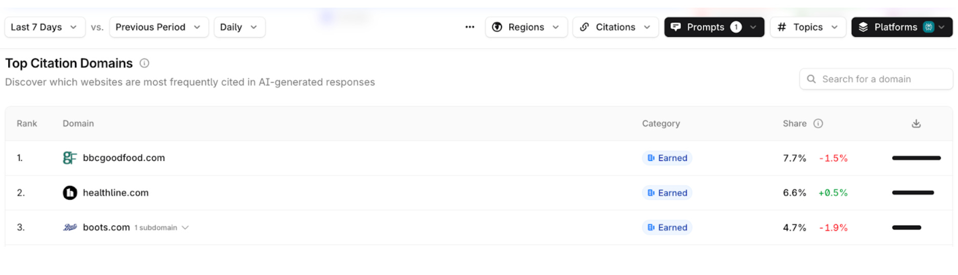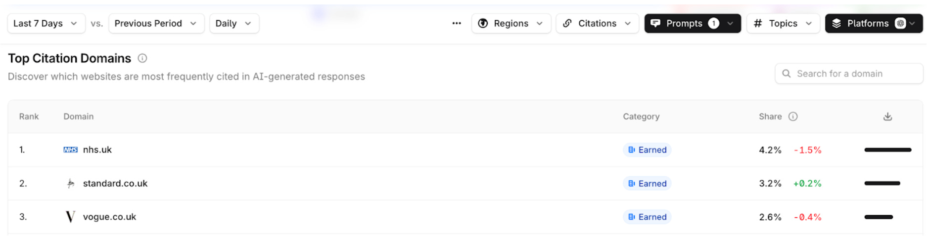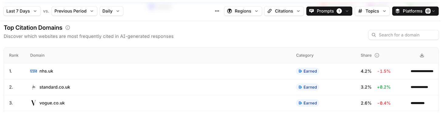 Currently, LLMs lean on a surprisingly small set of “trusted domains”. These domains are what you would typically expect if someone talked about a ‘high authority’ site, BBC, The Guardian, Forbes, to name a few.