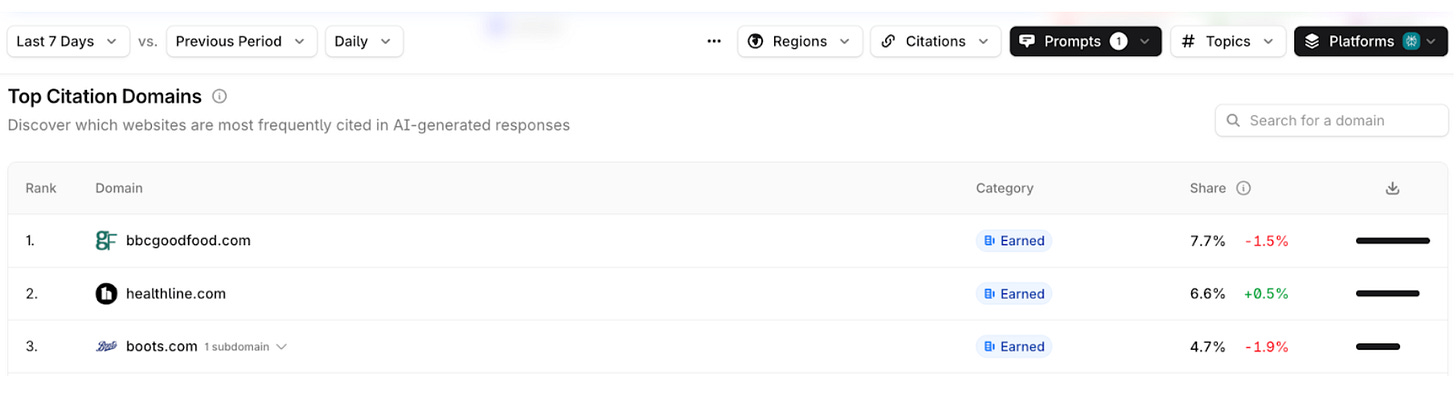 AI, though, is not one single platform. It’s becoming increasingly evident over time that each model cites sources differently. As an example, ChatGPT and Perplexity do not prioritise sources in the same way. See below an example from a British nutraceutical brand:
